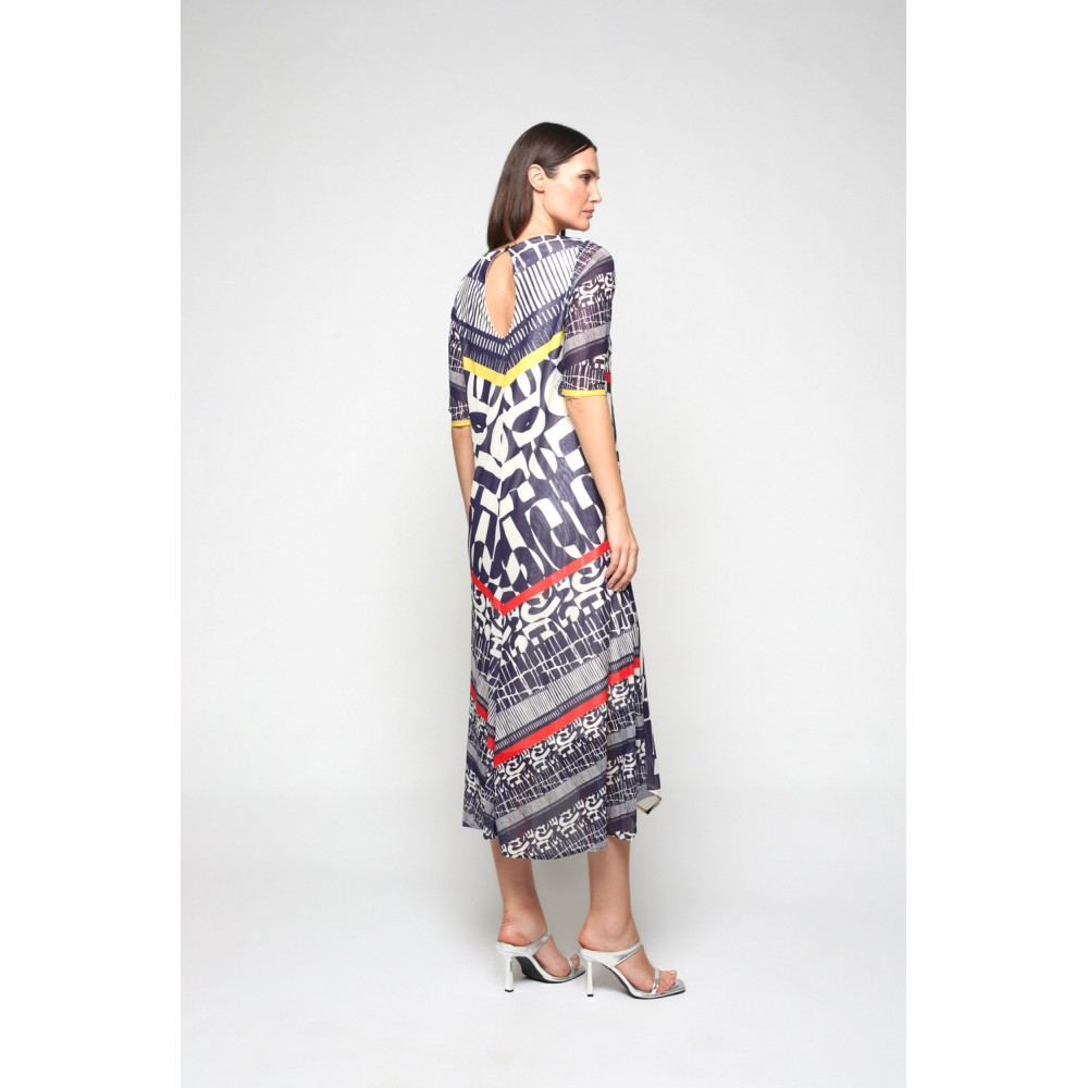 Vestido de estampación propia en punto de seda. Escote pico, con lagrima en trasera y apertura mediante botón.