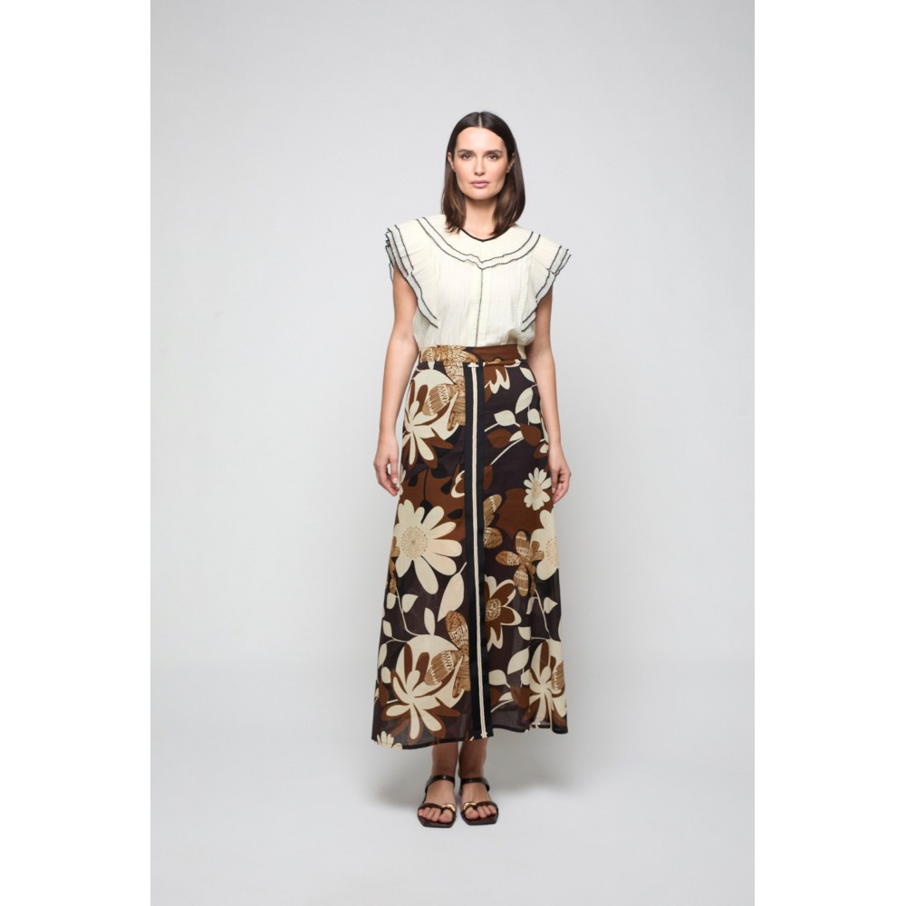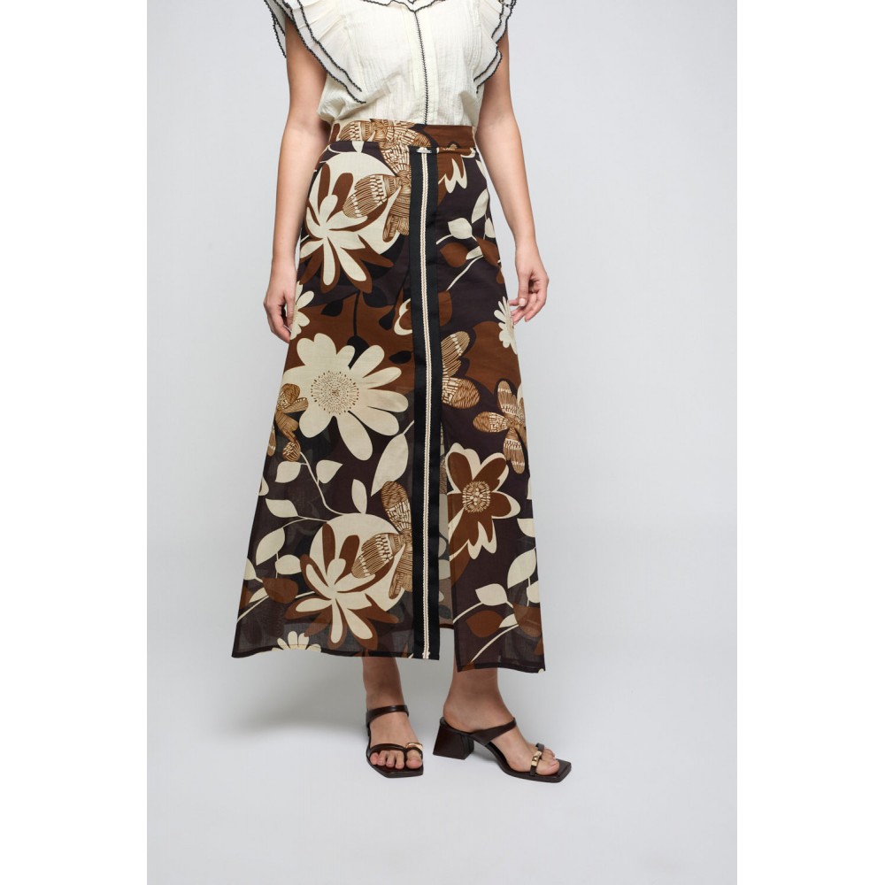 Falda de estampado de flores con abertura en la delantera, camuflada bajo la pasamanería.