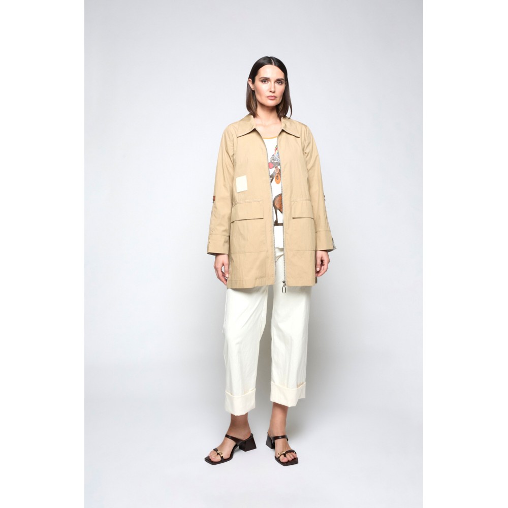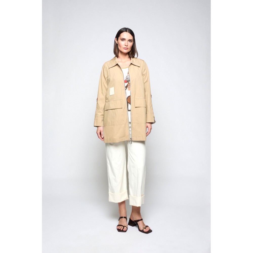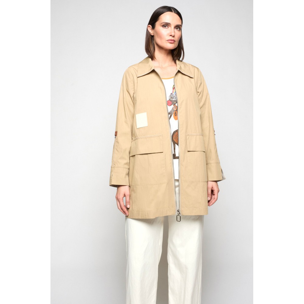 Gabardina confeccionado en hilatura con mezcla de algodón. Cuello solapa y manga larga con remate de puños en tejido de rayas. Bolsillos en delantero. Cierre frontal mediante cremallera metálica. Detalle de pasamanerías en bolsillos y cuellos. Largura por debajo de la cadera.